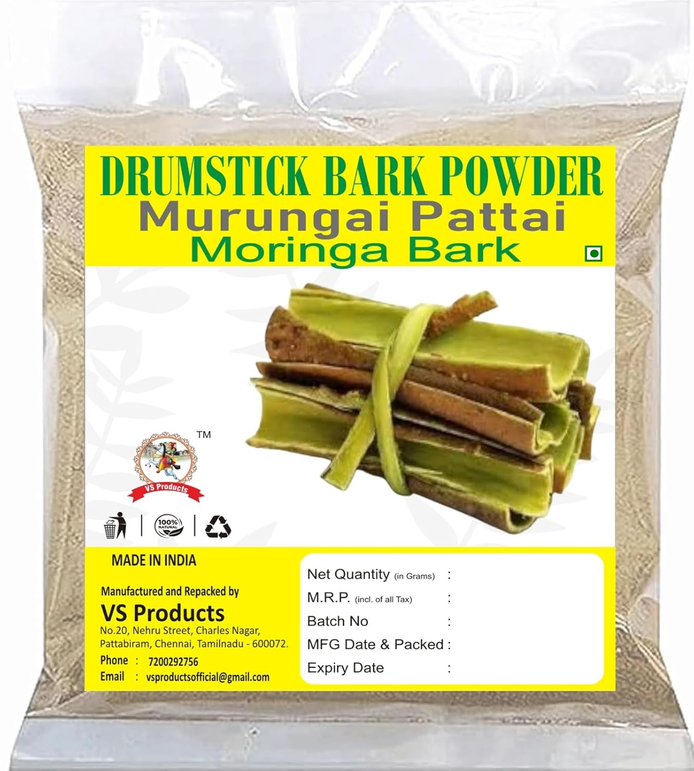 Murungai Pattai Powder is made from carefully selected bark of the Moringa oleifera, traditionally known as the drumstick tree. The bark is cleaned, dried, and finely ground to achieve a smooth and consistent texture.