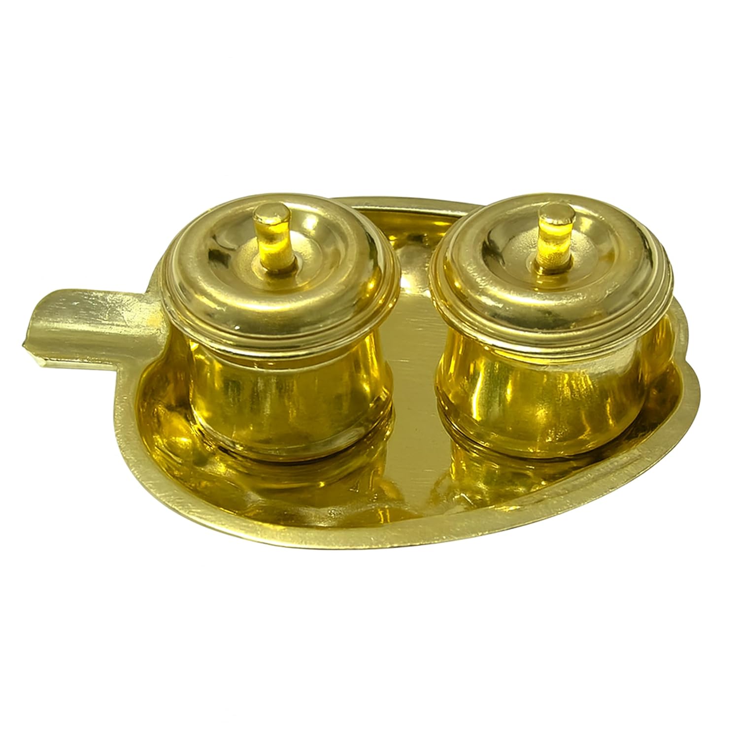 Dual Container Design ? Comes with two small brass holders placed on a single tray for keeping kumkum, chandan, or turmeric.